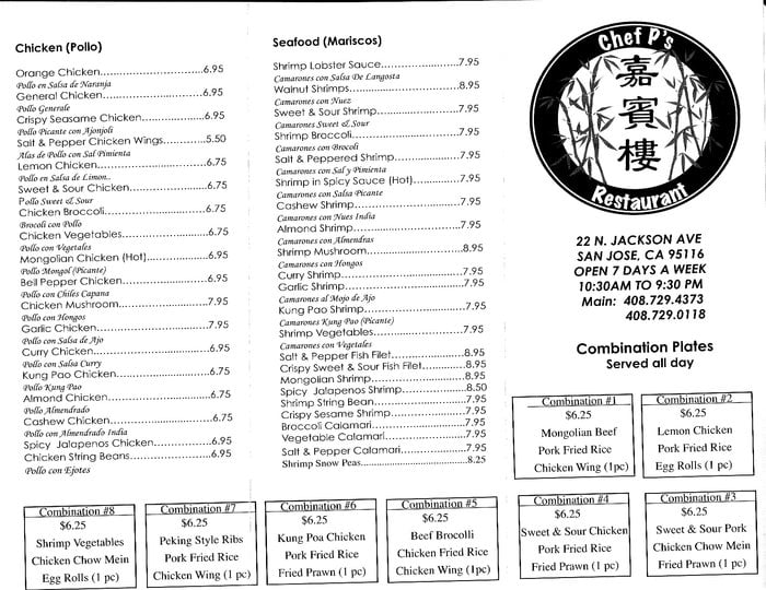 Chef P’s is a Chinese seafood restaurant located in San Jose, CA, known for its generous portions, affordable prices, and delicious dishes. The menu features a variety of appetizers, soups, and chicken dishes, with highlights such as the Wor Won Ton Soup, Orange Chicken, and Cashew Chicken. Customers rave about the flavorful food and commend the attentive service provided by owner Loyd and his team. The restaurant offers delivery, takeout, and catering services, making it a convenient choice for a tasty meal. With options for vegetarians and a casual, welcoming atmosphere, Chef P’s is a great spot for lunch, dinner, or group gatherings. Whether you're in the mood for traditional Chinese favorites or looking to try something new, Chef P’s has something for everyone.
